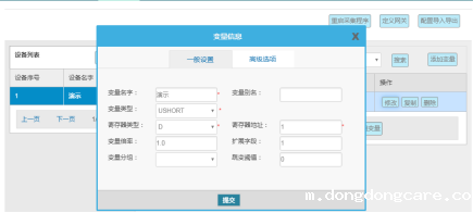 变量配置主要是定义变量名(自定义内容,不可使用中文命名)、变量别名(自定义,可使用中文名字)、寄存器类型和寄存器偏移地址,并定义一些数据规则(如:倍率、小数点、单位、告警)。