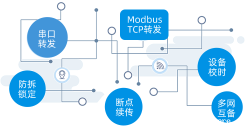 串口转发、Modbus TCP转发、设备校时、防拆锁定、断点续传,多网互备等等