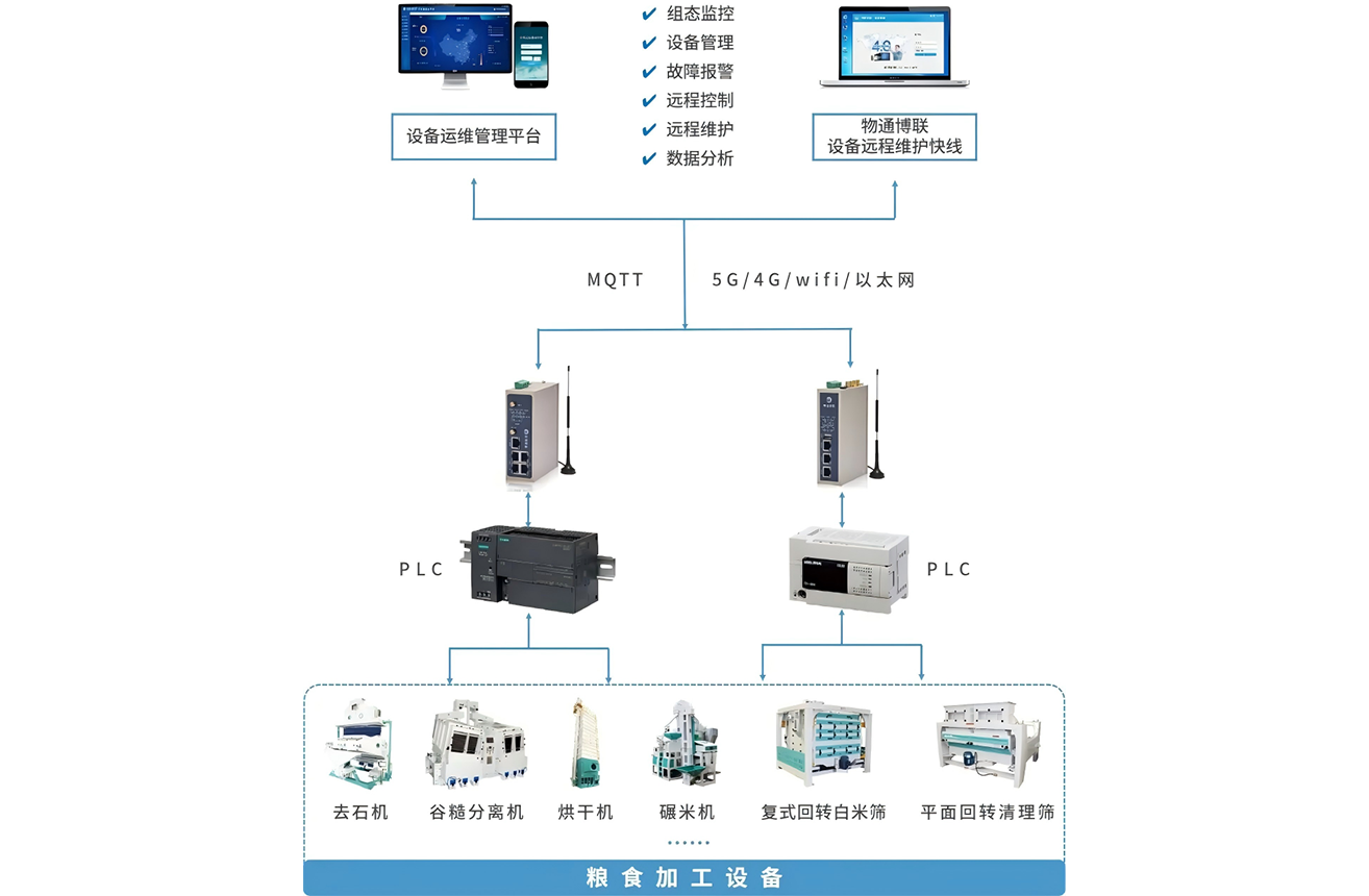 通过网关采集粮油机械设备的PLC,网关具有多种PLC的协议兼容能,同时支持5G/4G/WIFI/以太网等方式对接到云平台或上位机中。