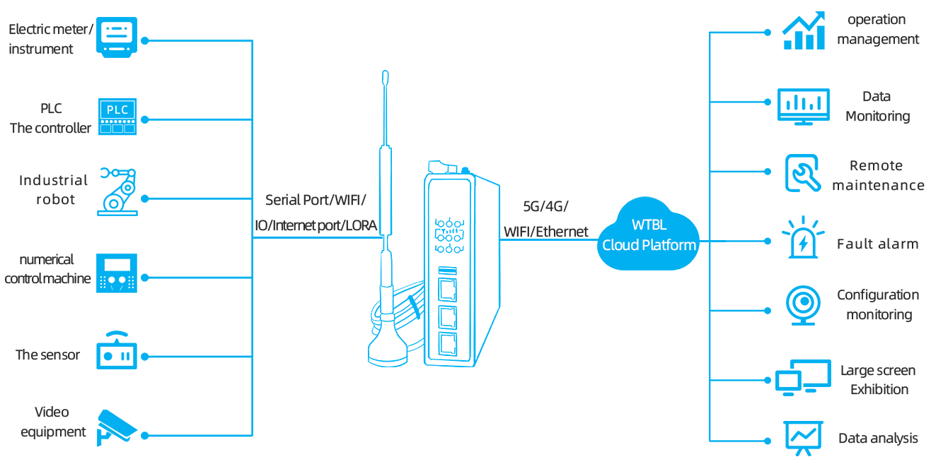 Wutong Bolian · WG series industrial intelligent gateway is a high reliability industrial intelligent gateway that supports the collection of data of various industrial equipment such as PLC, instrument, water environmental protection, power equipment, CNC, and has protocol analysis and edge computing. It is the core edge node for building industrial Internet system.
